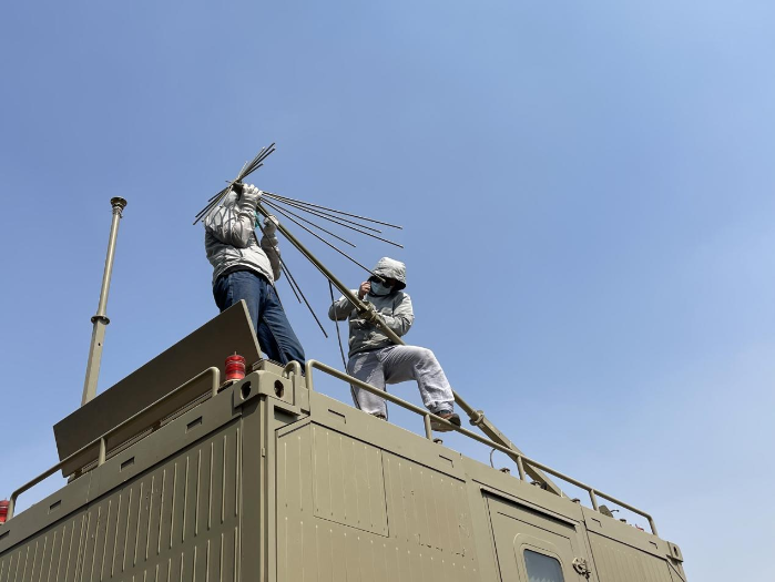 在非洲的沙漠大地上,電科萊斯某海外項(xiàng)目團(tuán)隊(duì)成員為了做好用戶設(shè)備維護(hù),在室外溫度40℃、設(shè)備艙頂50℃的高溫環(huán)境下開展作業(yè)。迎高溫、趕任務(wù)、保交付,他們?cè)诤M庠忈屩袊?guó)電科人的勇氣、責(zé)任與擔(dān)當(dāng)。
